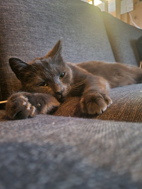 Sulten og frossen katt tatt inn i varmen da den stadig dukket opp på verandaen i søken etter mat. Trur den har hatt tilhold under verandaen eller i garasjen ei stund før jeg fikk den inn. Tok lang tid og masse list å få den i hus da jeg var redd den skulle fryse ihjel. Veldig sky og folkredd, men nydelig og kjælen da du først kommer innpå.