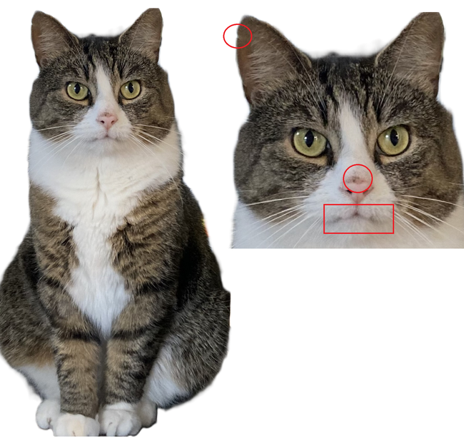 Tabbyfarget, hvit hals, bryst, mage og poter.