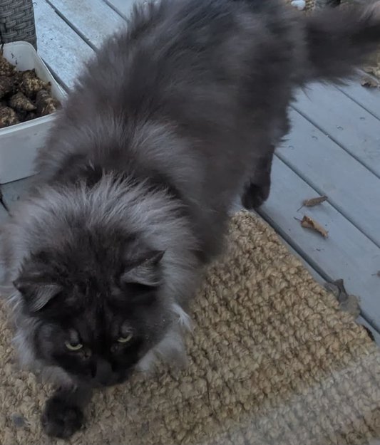 Rasekatt eller en blandingsrase. Alder ukjent. Tydelig at hun har vært drektig og fått et kull eller flere. Trygg jente og har tydelig et hjem og er vant til mennesker.