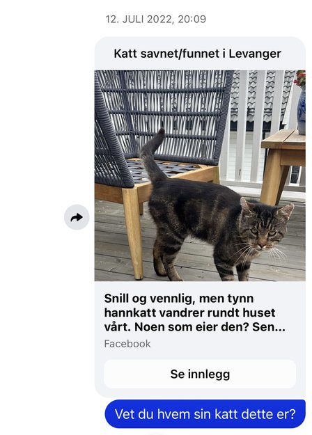 Eldre hannkatt , vandrer i et stort område, gått ute i området siden 2021 kanskje lengre. Vært etterlyst flere ganger. Ingen eier meldt seg.