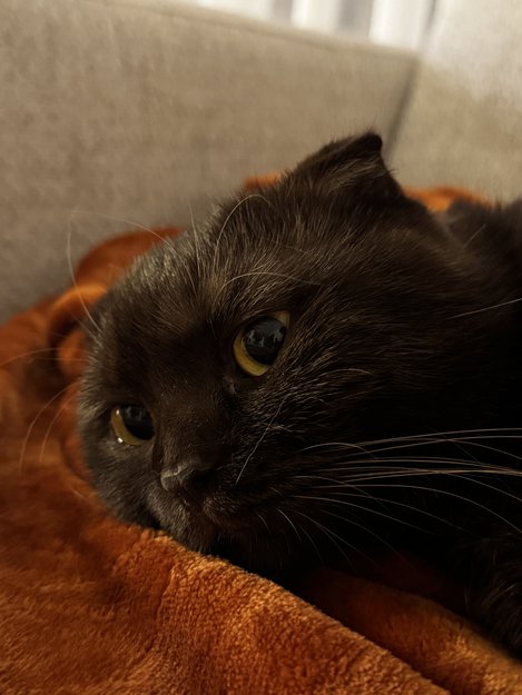 Hun er en veldig liten, brun Scottish Fold og heter Mueza.