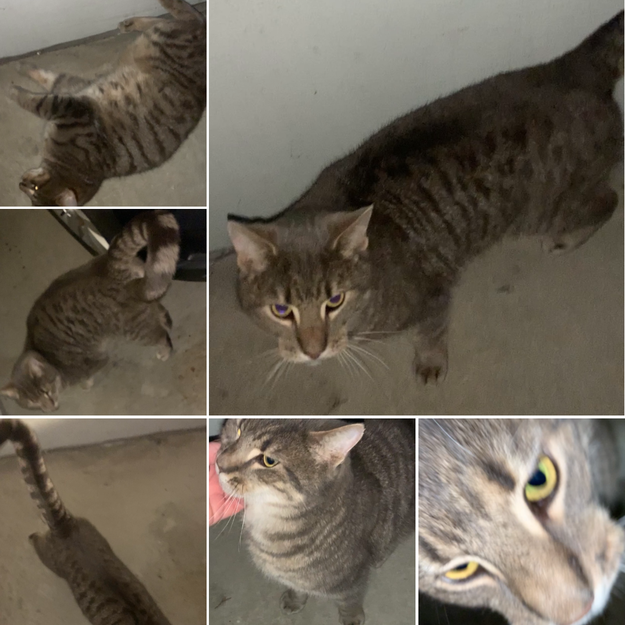 IKKE KASTRERT. Gule øyne. Utrolig kontaktsøkende, matglad og kosete. Ser ut til å lengte etter nærhet og varme. Lurer seg inn åpne dører. Gråfarget/brun med svake mørkere/lyse striper. Lysere under haken, potene og på magen. Mørk stripe langs ryggen og hele halen. Litt blank i pelsen. Vanskelig å beskrive farge på pelsen men grå-brun mest kommunegrå/mørkgrå/grå stripete/tabby/mørke + lyse striper. Mer medium gråbrun/lysgrå. Svart/Stripete mørk hale. Har video og fler bilder. Send helst SMS. Anrop blir ikke besvart.