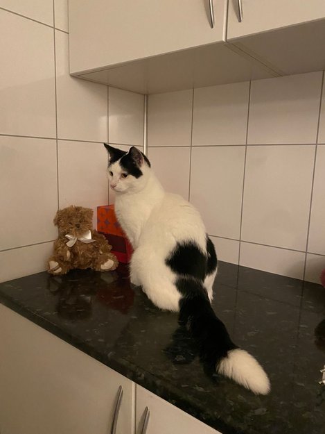 Hun er stor (større enn en gjennomsnittlig katt). Hun har kort pels. Hun har et lite arr på nesen. Hun er hvit med svarte flekker (en svart flekk i ansiktet som ikke dekker øynene, store svarte flekker på ryggen, en svart hale med en hvit tupp og en svart flekk på bakbeinet). Hun er redd for andre mennesker, dyr og høye lyder, og gjemmer seg veldig godt, spesielt når hun er redd. Og hun har gule øyne.