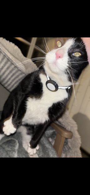 Hang utenfor huset vårt hele 22.1.26, tydelig sulten, har air tag men vi får ikke lest av m vår iPhone. Tatt inn og fått mat men vil ut, bygget le til den og den er her fremdeles 23.1