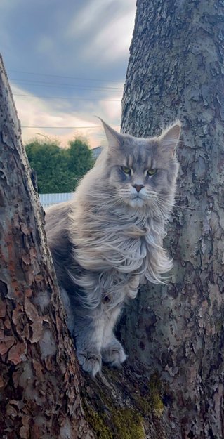 Stor og stolt Maine Coon hannkatt. Grå og lyse tegninger. Ikke spesielt sosial, engstelig for andre dyr.