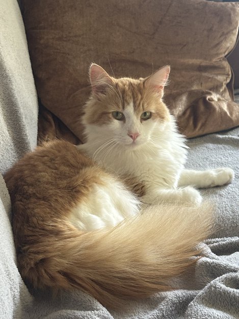 Hvit stort sett på nedre del av kroppen, altså under mage. Har et slags hakk med hvitt mot det oransje i ansiktet. Lang hale med mye pels. Han kan mjaue høyt, men som beskrevet ganske skeptisk til fremmede.