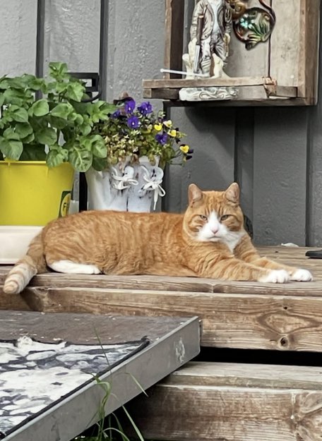 Han er kastrert, men dessverre ikke chippa. Halen hans er lys.