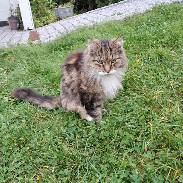 Stor hannkatt med lang pen pels. Hvitt i brøstet og brungrå ellers.og hvitt under magen.har svart bakpå potene.Er nokså kjolen og tillitsfull.og begynner å bli gammel 14-15 år.