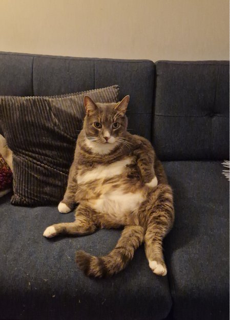 Grå katt med hvite felt på snute, hals, mage og labber. Stor katt, var 10 kilo da han forsvant. Han er sky, så vil sannsynligvis ikke komme opp til folk. Lav stemme, litt vanskelig å høre. Snill gutt 🥰