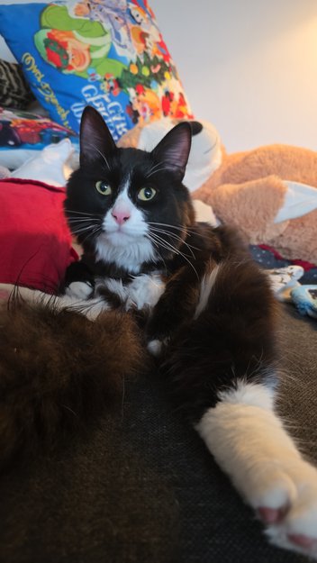 Felix er nå ca 7 mnd, ble funnet ute tynn og utsultet i begynnelsen av oktober, det ble lagt ut flere innlegg på savnet å funnet sider hvor jeg lette etter eiger, innleggene ble aldri besvart bare slettet, etter en uke med mislykkede forsøk på å finne eiger tok jeg han med meg hjem, la ut et siste innlegg som igjen bare ble slettet, jeg valgte da å beholde han selv og i november chippet jeg og kastrerte jeg han på meg. 20 januar klarte han å komme seg ut å har ikke blitt sett siden, jeg la ut et innlegg på samme savnet side som jeg etterspurte etter eiger,, jeg får da et anonymt svar på innlegget mitt fra en "venn" av tidligere eiger, denne vennen sier at dette er en kompis sin katt å at han ble borte for en stund tilbake siden og begynner å kreve bevis for hvor lenge jeg har hatt han, hvor jeg fikk han fra å når han ble chippet, jeg har nå mistanke om at de har tatt felix tilbake, noe jeg mener er litt for sent for de å begynne å bry seg om nå. Det ble heller aldri lagt ut noe innlegg fra tidligere eiger om at de savnet katten mens jeg hadde han, det har derimot blitt lagt ut flere innlegg fra naboer, og barnehagen i nærheten av denne eigeren som også bare ble slettet, har kansje blitt lagt ut 10 innlegg fra folk som leter etter eiger til denne kattungen som bare blir slettet,, jeg kom i kontakt med noen som kjenner denne mannen som sier at han aldri var hjemme og at Felix alltid var ute, ble bare tatt vare på da barna var hjemme som var 8 dager i mnd,. Felix er dypt savnet av sønnen min, meg og de andre dyrene vår og ønskes hjem så fort som mulig