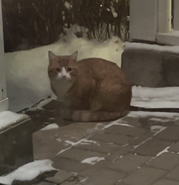 Vi og nabo har en katt som kommer hver kveld og natt nå i kulda. Jamrer og mjauer fært. Har lagt ut annonser om noen eier den. Prøver å få tak i den for å ta den inn da den står på terrassedøra men da løper den unna. Har to katter selv så vet hvor kalde de blir nå. Har satt ut pappeske med isopor, flees og ull i. Har også satt ut tørrfòr. Naboen har gjort det samme.