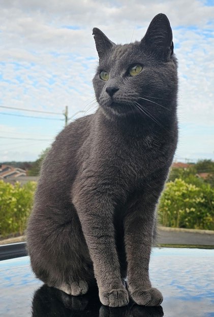 Kort grå pels med en bitteliten hvit flekk. Lite hakk i høyre øre.