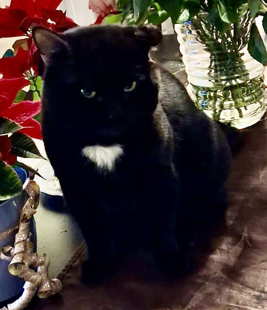 Han et svart med en hvit flekk på brystet. Det venstre øret er flatt og han er barbert litt på halen. Han var hos dyrlegen for en uke siden.
