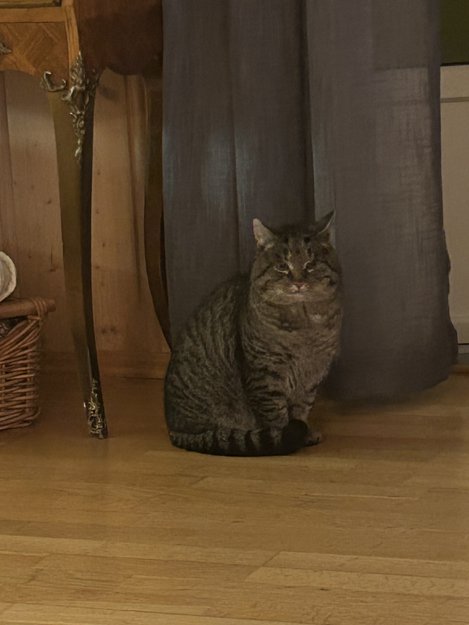 Tigerstripet katt (grå og svart) er funnet på Borgen som ligger 7 km unna Kløfta i Ullensaker kommune. Pus har gått rundt på feltet her siden sommeren 2025, og nå syns vi at han går mye ute tross kuldegrader. Vi søker derfor etter om den har en eier. Den er inne og spiser hos oss, men stikker av når vi prøver å nærme oss den.