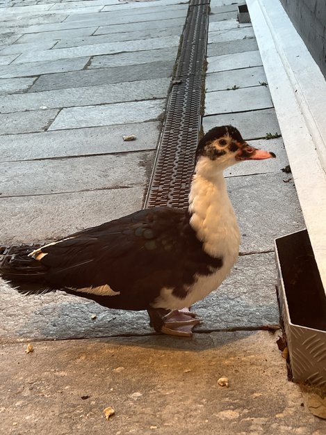 Søt liten and sitter utenfor døren. Er ikke redd for folk