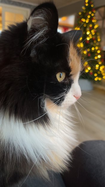 Sort, hvit og flekkevis brun tillitsfull katt på 4 år. Hvit på magen, hvite poter, hvit rundt munn, nese området og stor flekk brun pels ved øynene. Og hvit "krage" pels rundt halsen. Ellers svart med noe brunt innimellom. Hun er chippet og sterilisert.