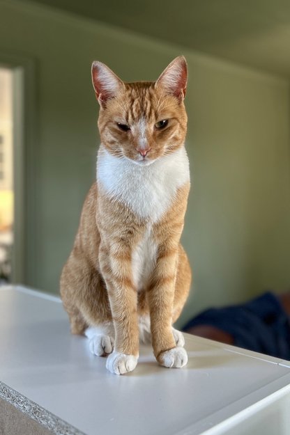Oransje korthåret katt med hvitt bryst og hvite poter. Hvit stripe på nesen og hvit underkjeve. Utrolig kosete og kontaktsøkende katt. Veldig nysgjerrig og glad i å utforske, spesielt lukkede rom som garasjer, biler, bokser osv.