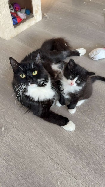 Svart og hvit. Hvit på potene og brystet. Hvit på ene siden på overleppa.