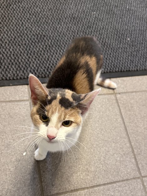 Kald og mager katt satt utenfor inngangsdøren. Ikke sett i nærområdet før. Vil inn i varmen. Veldig tam og kontaktsøkende. Ser ung ut.