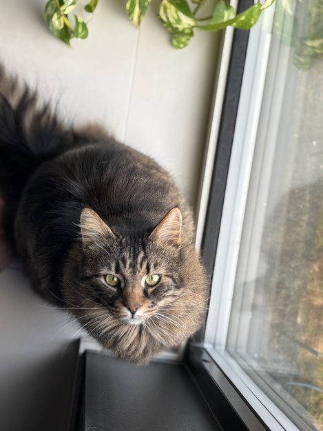 Stor norsk hannkatt, grønne øyne og brunsort pels