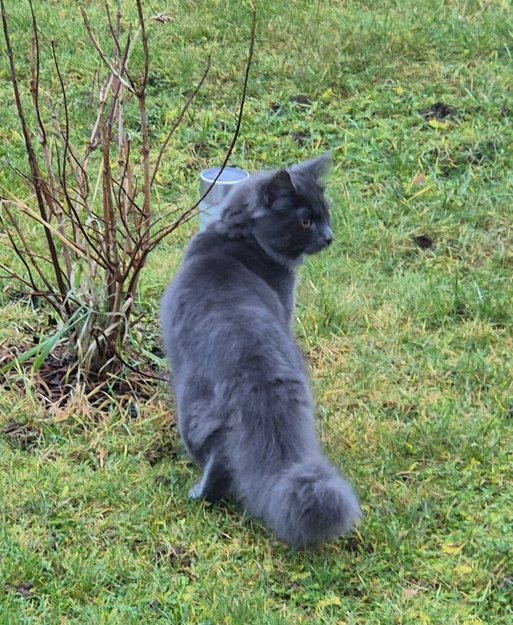 Elvis er ca 7 måneder, ikke vant til å være ute, men lørdag morgen kom han seg ut I 7- tiden. Han er veldig pysete, redd for fremmede, redd for høye ukjente lyder. Hvis han ble skremt av en lyd, kan han ha løpt og gjemt seg.