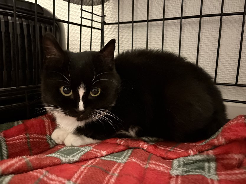 Svart og hvit. Hvit stripe mellom øynene. Ca 3-4 mnd gammel. Undervektig