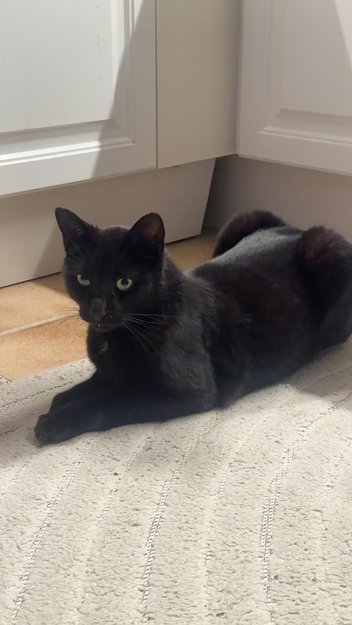 Svart, med liten hvit flekk på brystet. Lite «hakk» eller bitteliten prikk uten hår, bak på venstre øre. Veldig kosete og maler veldig høyt når den får kos. Ikke chippet. Svarte værhår.