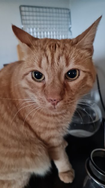 Sorte prikker på nese og helt oransje - har ikke hvite flekker eller sokker. Blått halsbånd med radiosender, men det kan ha falt av. Rundt 6kg, fire år.