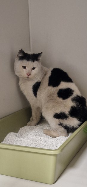 Hvit med sorteflekker, tynn, forfryste ører, veldig tynn