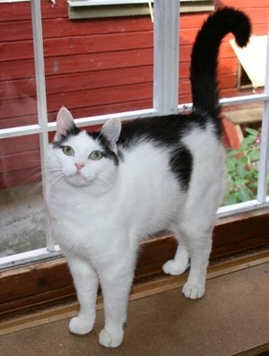 Katten er hvit og sort.
