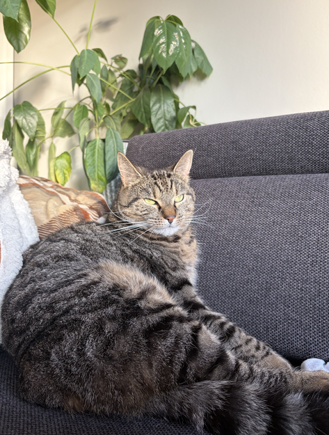 Ganske stor katt, som rusler en del rundt. Veldig tam og kosete, så kan fort finne på å bli med fremmede inn for litt kos og mat