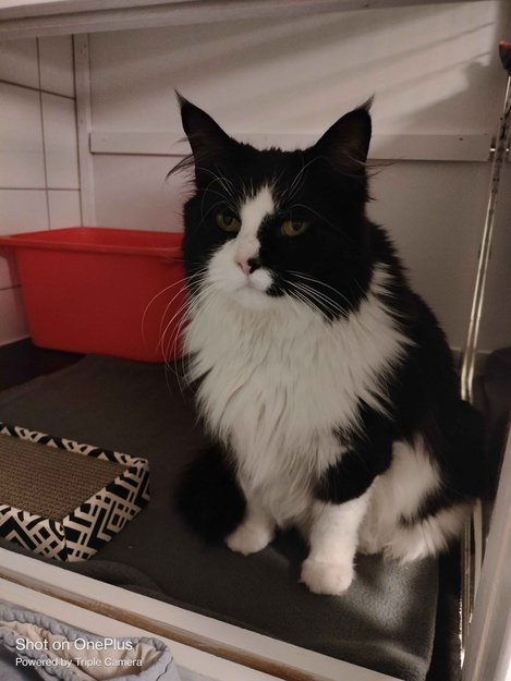 Har oppholdt seg i et boligfelt på Lippestads vei ved Emma Hjorth siden sensommeren. Katten har i senere tid blitt mer og mer rufsete i pelsen, så først nå ble det antatt at katten ikke bor 7 nærheten allikevel. Katten har hatt god tilgang på mat da den er i veldig godt hold.