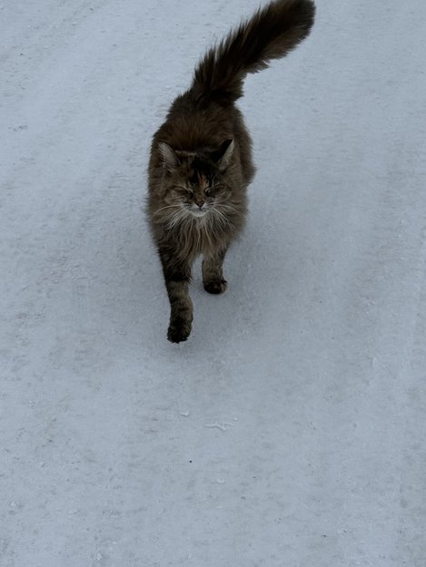 Men den dukket opp igjen 20 februar 2026 og var veldig kosete og kontakt søkende, men ufattelig tynn, katten er rett og slett radmager, bare skinn og ben omtrent.