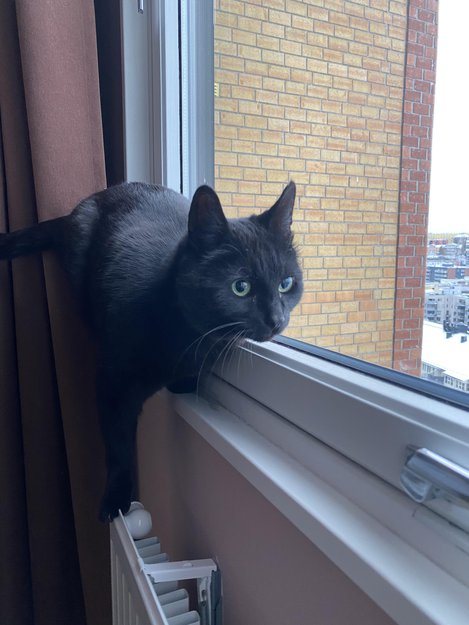 Katten har svart, kort pels med en anelse hvitt på undersiden. Ikke så veldig stor, så muligens en litt ung katt. Heldig for oss, veldig kosete og pratsom.