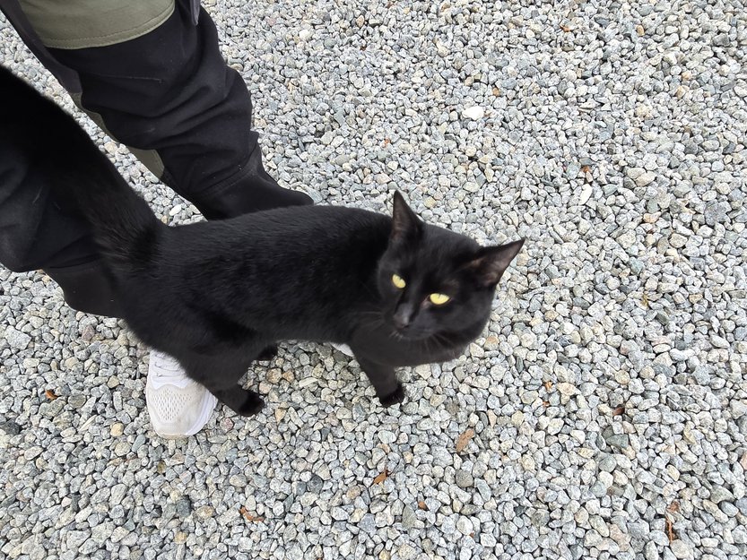 Denne katten ble observert først mjauende i gaten, og endte til slutt opp på trappå vår der hun forble i 24 timer før vi kjørte henne til dyrlegen. Hun er ikke chippet. Vi har tatt henne inn til oss midlertidig. Hun går ut litt nå og leter men kommer fort tilbake igjen sliten og sulten. Tror ikke hun finner veien hjem.