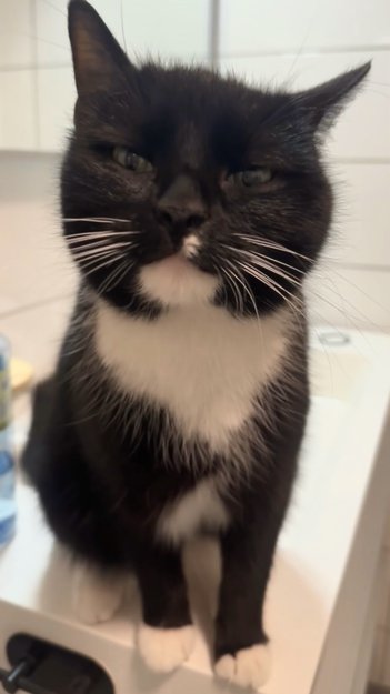 Sort katt med hvite bein bak og to hvite poter foran. Hvit under haken og på magen, samt en liten hvit prikk under nesen.