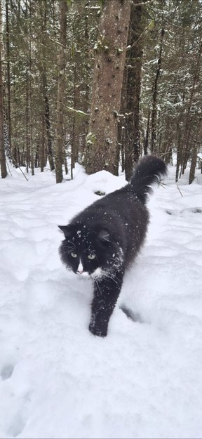 Han er sort med lang pels å hvit på mage, potene å nesen, han har rosa nese med litt sort på.