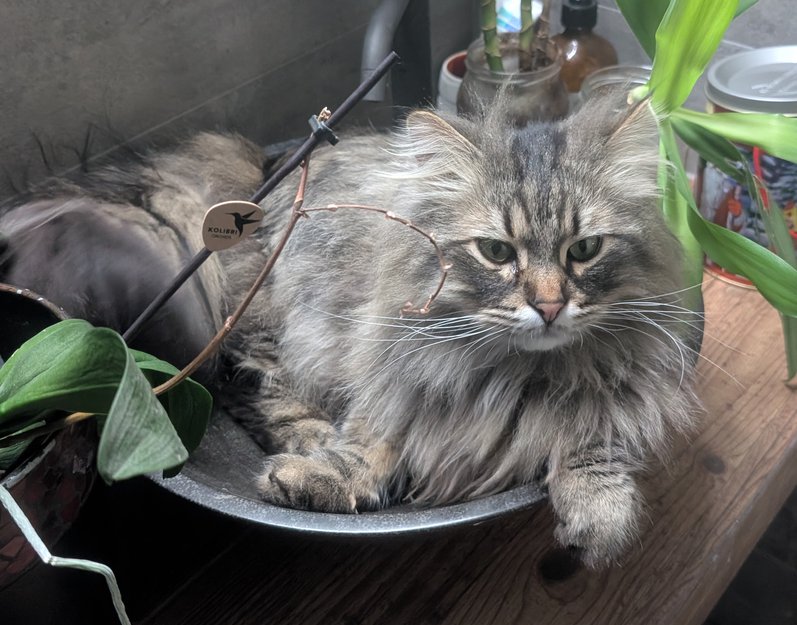 4.5 år gammel med bred hale. Ikke redd for mennesker. Reagerer på "mjau" og "figaro".