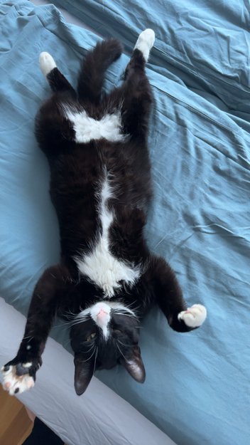 På sommeren kan hun være ute lenge, 4 dager er vel det lengste. Men hun er svart og hvit, men ca halve halen kappet av, og hun er veldig liten, så halen er kort og hun er liten, med en hvit snute og store ører.