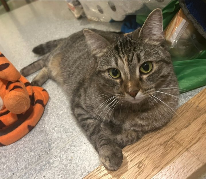 Hun er litt over 2 år gammel og en grå/brun stripete katt med grønne øyne.