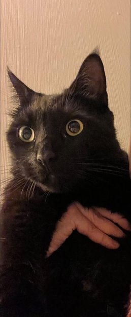Han har bred nese, veldig bred. Veier 6–7 kilo. Stor, svart hannkatt med noen få hvite hår (4–5) på brystet. Gule øyne. Hvis han er innestengt, reagerer han ikke på fremmede. En gang ble han låst inne i garasjen til huseieren, og da døra ble åpnet, freste han bare.