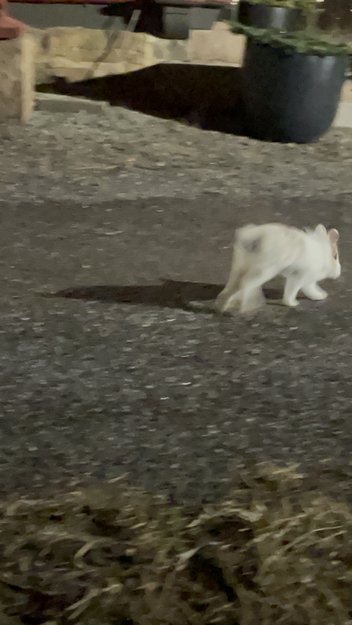 Den er hvit med lysebrune eller grå flekker. Det virket som om den har en løvemanke,men det var vanskelig å se i mørket. Den virker ung og sprek. Ikke redd, men hadde ingen planer om å bli fanget.