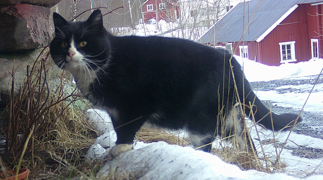 Katten er sky, men vi skjønte omsider at den antagelig har bodd i en låve i nærheten i vinter. Den kan ha bodd ute i flere år, og virker ikke vant til mennesker per nå. Den er fanget inn og tatt i fosterhjem. Den er ikke undersøkt for chip og kjønn ennå.