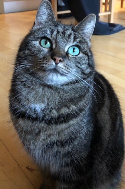 Liten hunnkatt, hvit prikk på brystet. Grønne øyne.