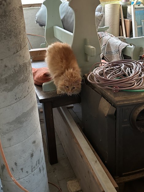 Det har gått en katt siden høsten 2025 hos oss. Den er redd for mennesker, men vil prøve å komme inn. Den har blitt venn med katten vår. Har flokete pels.