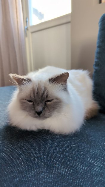 Hvit hellig birma med noen mørke/grå spots på fjeset, ører, bein og hale. Veldig rolig og tillitsfull katt.
