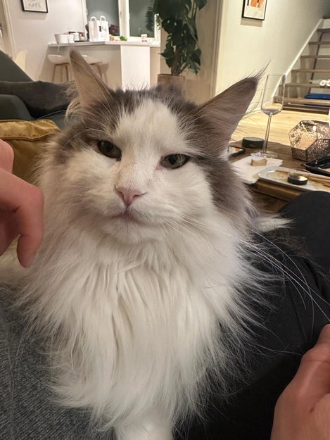 Lang hvit pels med gråe flekker og helt grå hale. Han er stor og veier nesten 7 kg, så han er større enn en gjennomsnittlig katt. Han er veldig kontaktsøkende og lager masse lyd for å få oppmerksomhet.