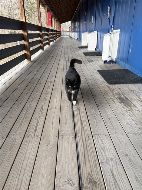 Voksen/ung katt har oppholdt seg rundt industriområdet ved Solbergelva i en periode. Den har fått mat av diverse beboere på brakkerigg ved Åserud. Venter gjerne her på riggen til folk ankommer. Svært sosial, folkekjær.