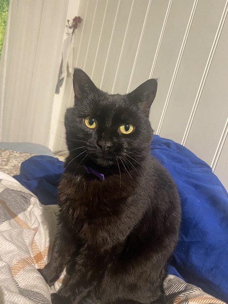 Svart hunnkatt.Hadde på seg lilla halsbånd, lager små“pipe” lyder som mjauing. Svart tattovering i øret. Runde gule øyne, med litt grønt innerst i riktig lys.Liten, kosete.få hvite hår på brystet.