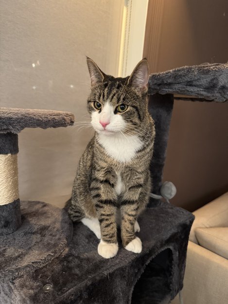 Forbeina er stripete, bakbeina er hvite. Han er veldig vennlig
